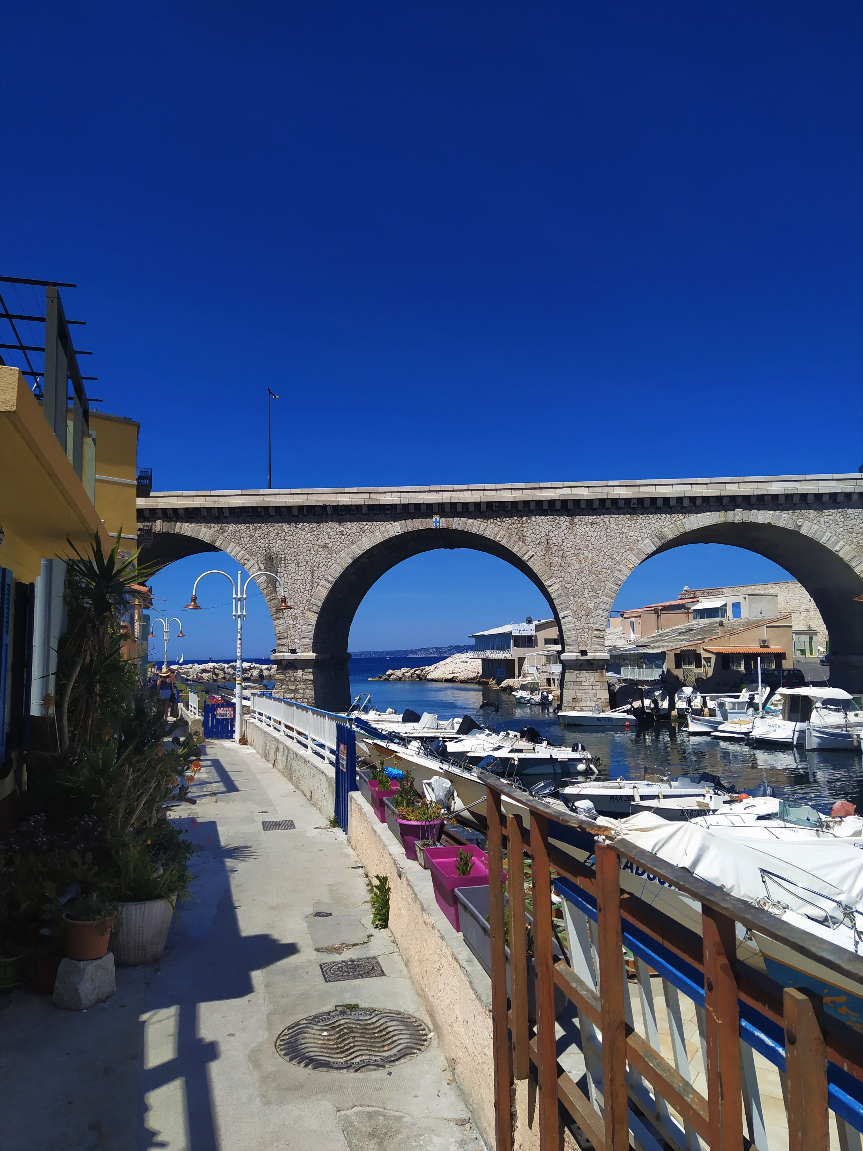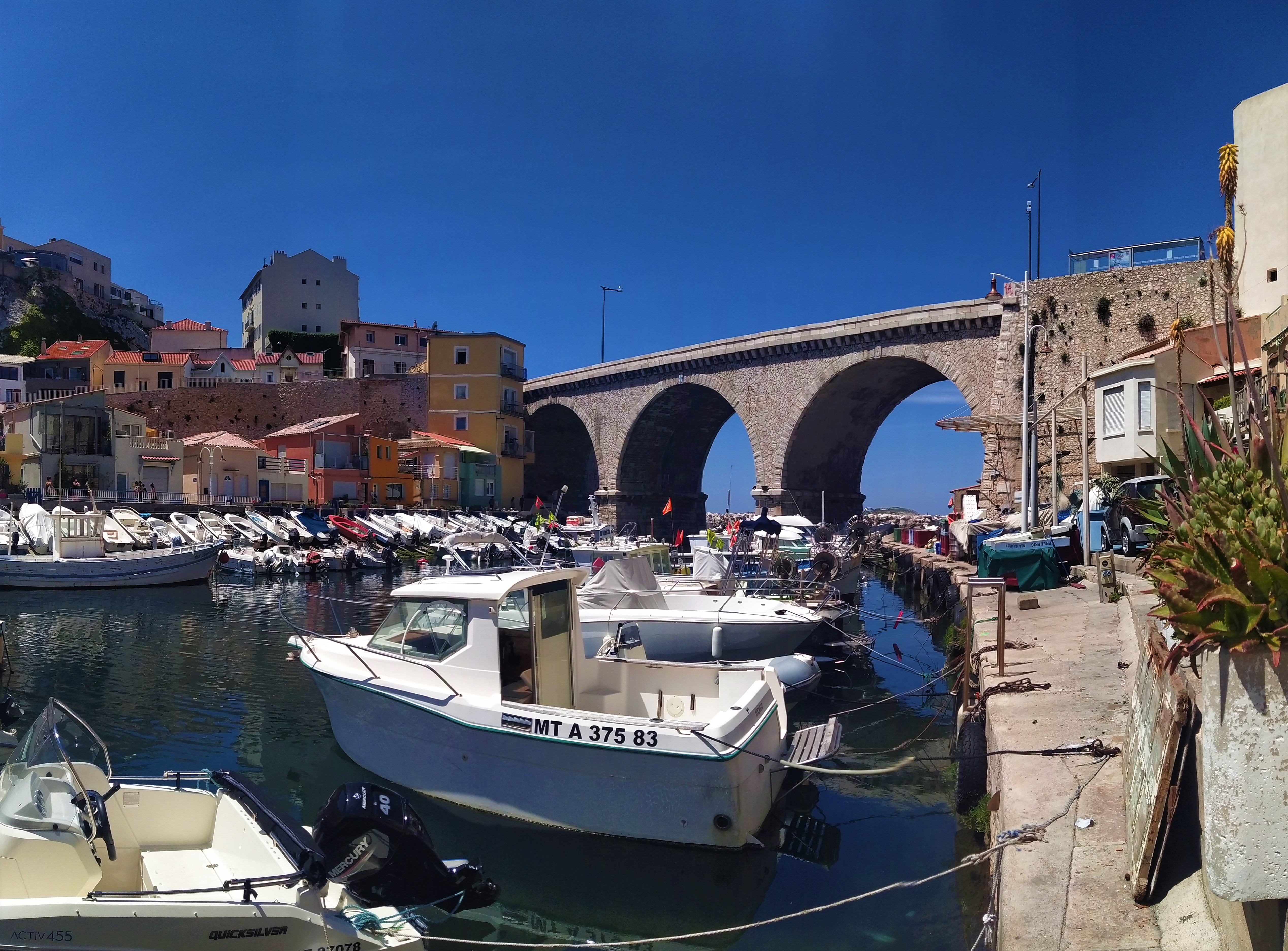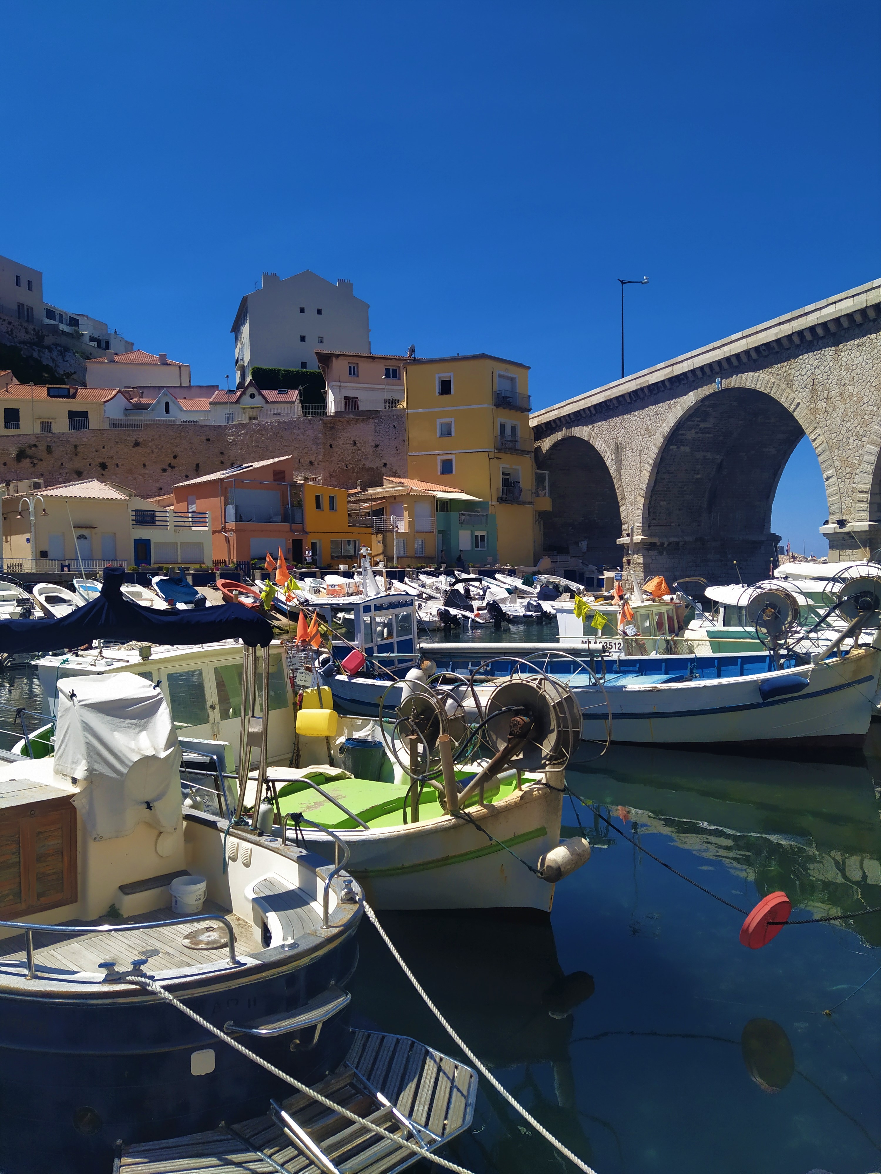 Ce petit port traditionnel fait figure de radeau abandonné, échoué entre quelques grands ensembles et un imposant pont de béton qui déploie ses trois imposantes arches, au dessus du port. Car, en effet, l’aspect le plus étonnant de ce lieu est sans aucun doute sa petitesse, qui est renforcée par le creux naturel dans lequel les petites maisons de pêcheurs viennent se loger, les unes sur les autres, formant un amas charmant de petites cases colorées, à l’ombre des colosses de béton.